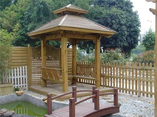 防腐木亭子具有体积不大、用料较少、设计灵活、建筑方便等特点,很适合园林景观布局的需要。防腐木亭子是在我国园林景观绿化中运用多的一种建筑形式。无伦是古典园林景观,还是现代园林景观中,都可以看到各种各样丰富多彩的防腐木亭子,屹立于山冈之上;或依附在建筑之旁;或漂浮在水池之畔。以玲珑美丽、丰富多样的形象与园林景观中的其他建筑、山水、绿化等相结合,构成一幅幅生动的画图。贵州防腐木亭子成了为园林景观空间和自然山水增添美色的重要点缀建筑物。防腐木亭子的作用一方面是点缀园林景观空间、提升环境层次,另一方面是解决人们在旅游休闲中驻足休息,纳凉避雨、眺望景色的需要。