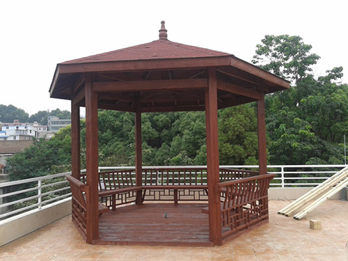 防腐木凉亭,是指用防腐木组建而成的凉亭。所使用的防腐木是经过特殊防腐工艺处理后的木材,具有防腐烂、防白蚁、防真菌的功效。故此类凉亭稳定性强、使用期限长、性价比高。